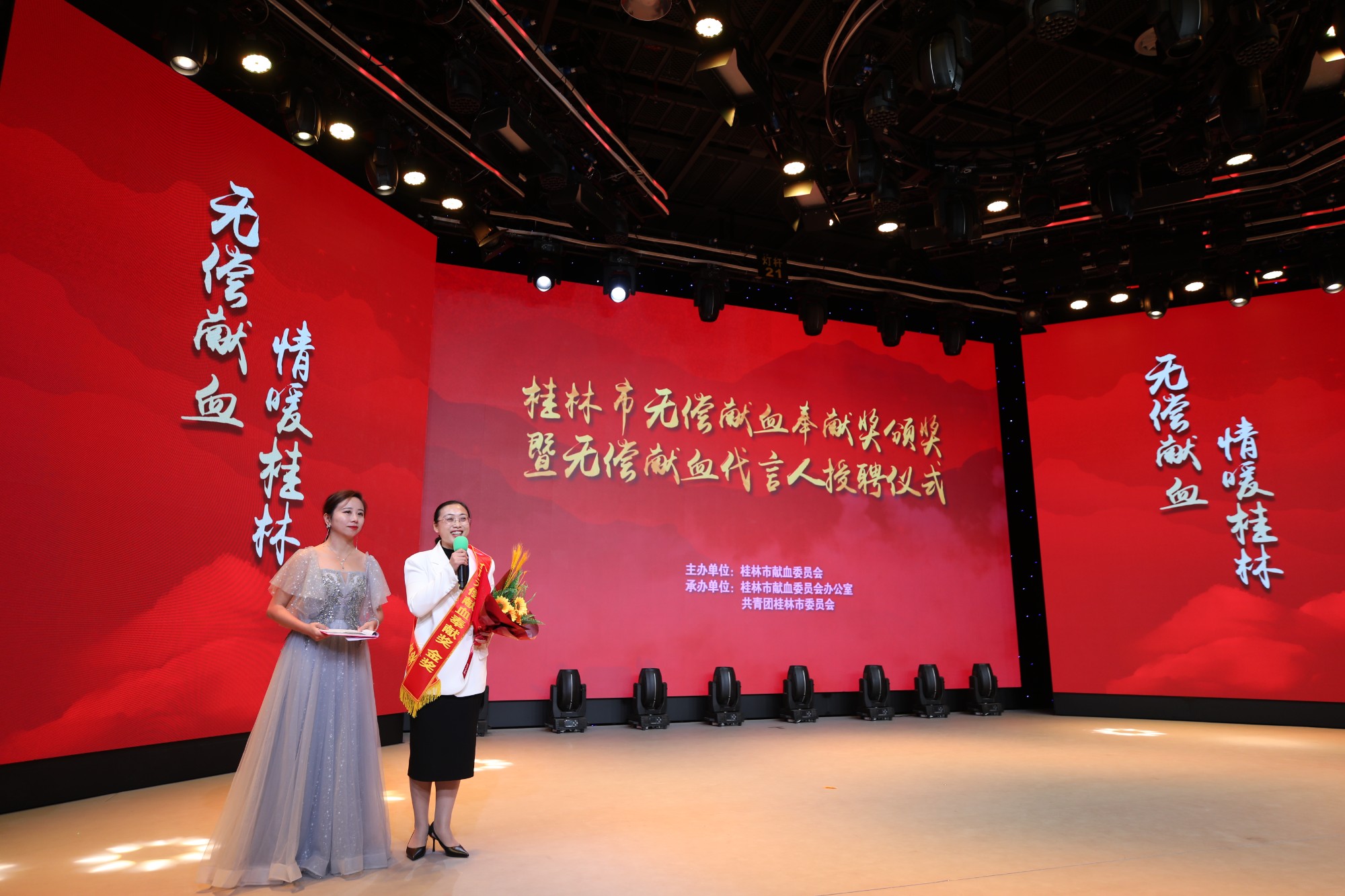 12月7日,桂林市无偿献血奉献奖颁奖暨无偿献血代言人授聘仪式在桂林市文广新大厦举行。广西壮族自治区南溪山医院外科第十三党支部书记、烧伤整形与创面修复外科护士长杨平荣获2020-2021年度“全国无偿献血奉献奖金奖”和“桂林市无偿献血形象代言人”。