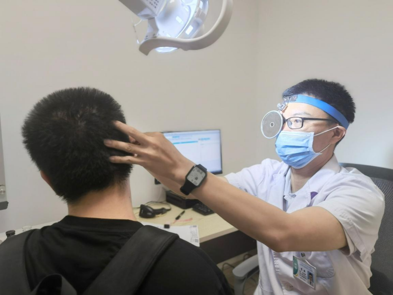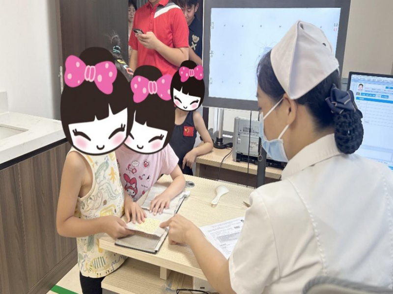 南溪山医院国际健康管理中心主任护师覃红桂正在为健儿检查辨色能力