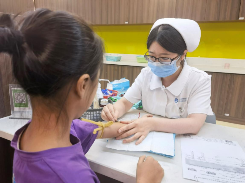 南溪山医院国际健康管理中心主管护师梁梦妮正在为健儿抽血