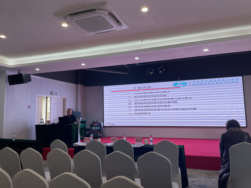 广西壮族自治区南溪山医院副院长胡长付教授致欢迎辞。该培训班的授课专家包括首都医科大学李义庭教授、广州医科大学刘俊荣教授、首都医科大学附属佑安医院盛艾娟教授、广西壮族自治区南溪山医院刘陶文教授。专家们以当下最重要的医学伦理学审查及防范伦理风险有关的14个专题展开解析及讨论,内容新颖、全面,涵盖科技伦理审查尤其是涉及人的生命科学和医学研究中有关伦理问题、新医疗技术、生物样本及健康数据、临床研究的重点案例、伦理审查要点及重点、医学研究知情同意书的常见问题等。