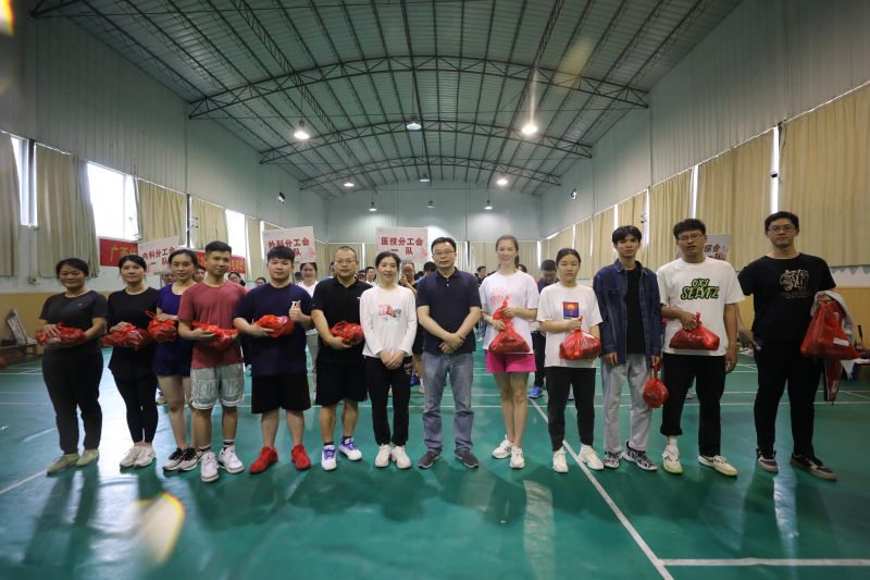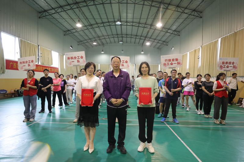 赛后的颁奖仪式上,医院党委副书记、工会主席张超群带领各分工会主席、代表为获奖队伍颁奖。桂林好风力科技有限公司董事长、象山区政协委员、桂林市委统战部新联会乡村振兴顾问组组长叶颖谦更是为55名参赛队员送上了比赛慰问品,他表示,慰问品中的牛肉、土鸡蛋、红薯粉、干辣椒等是桂林各县的乡村振兴产品,代表了乡亲们对南溪山医院近年为桂林疫情防控和医联惠民作出重大贡献的朴实问候,希望南溪山医院的职工们保重好身体,更好地为群众健康服务。