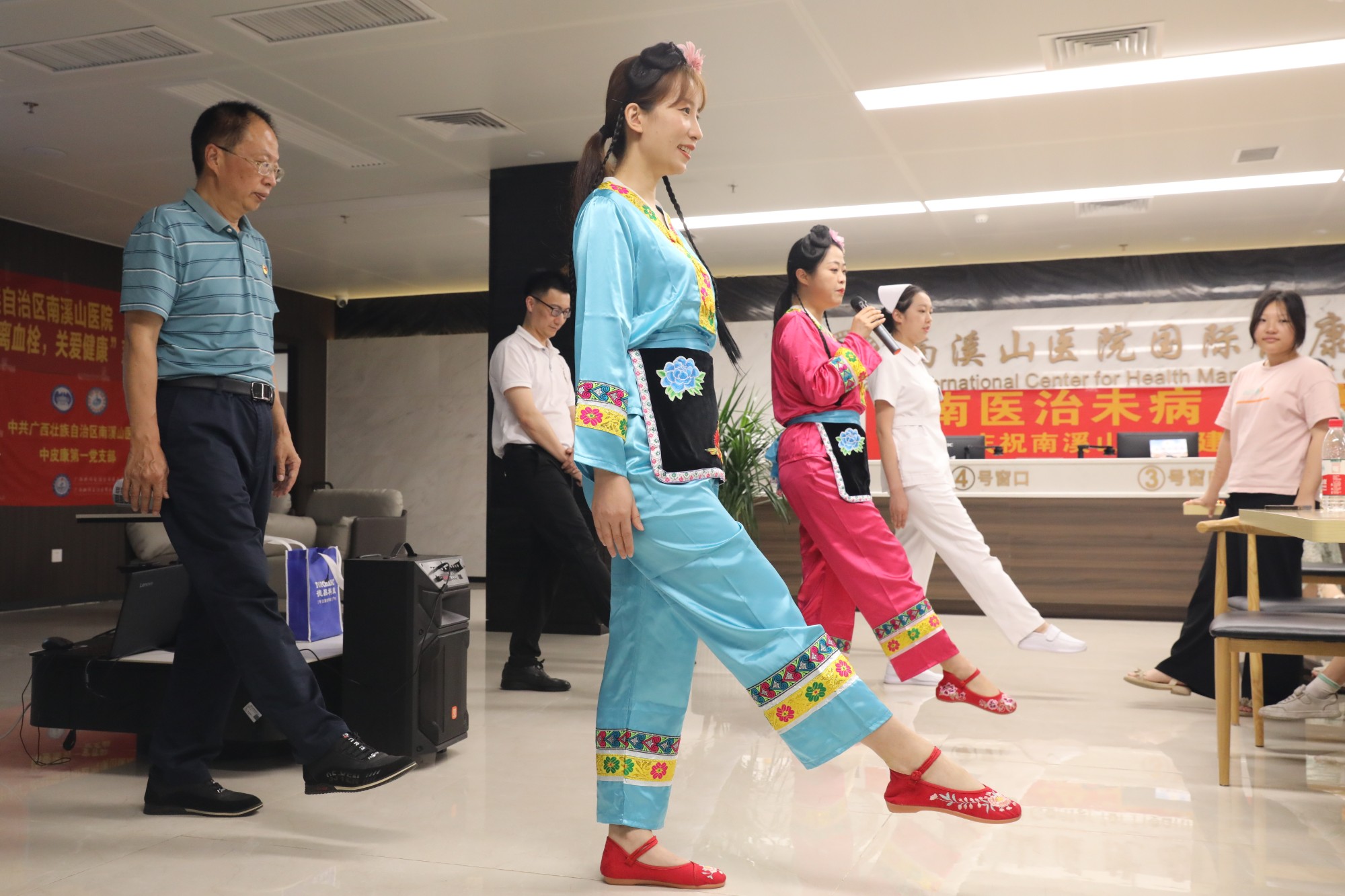 护士们身着刘三姐服饰,将预防深静脉血栓的健康知识用通俗易懂的语言、幽默风趣的表达方式传递给大家