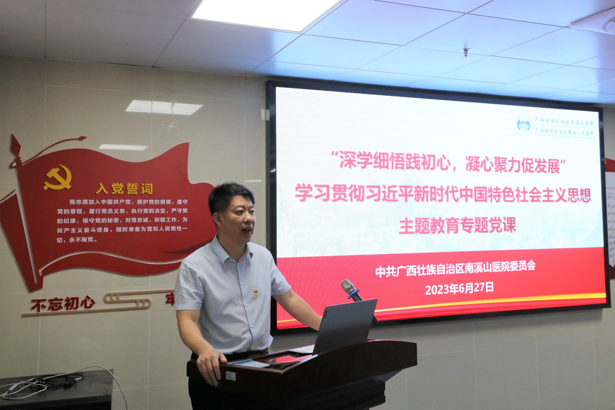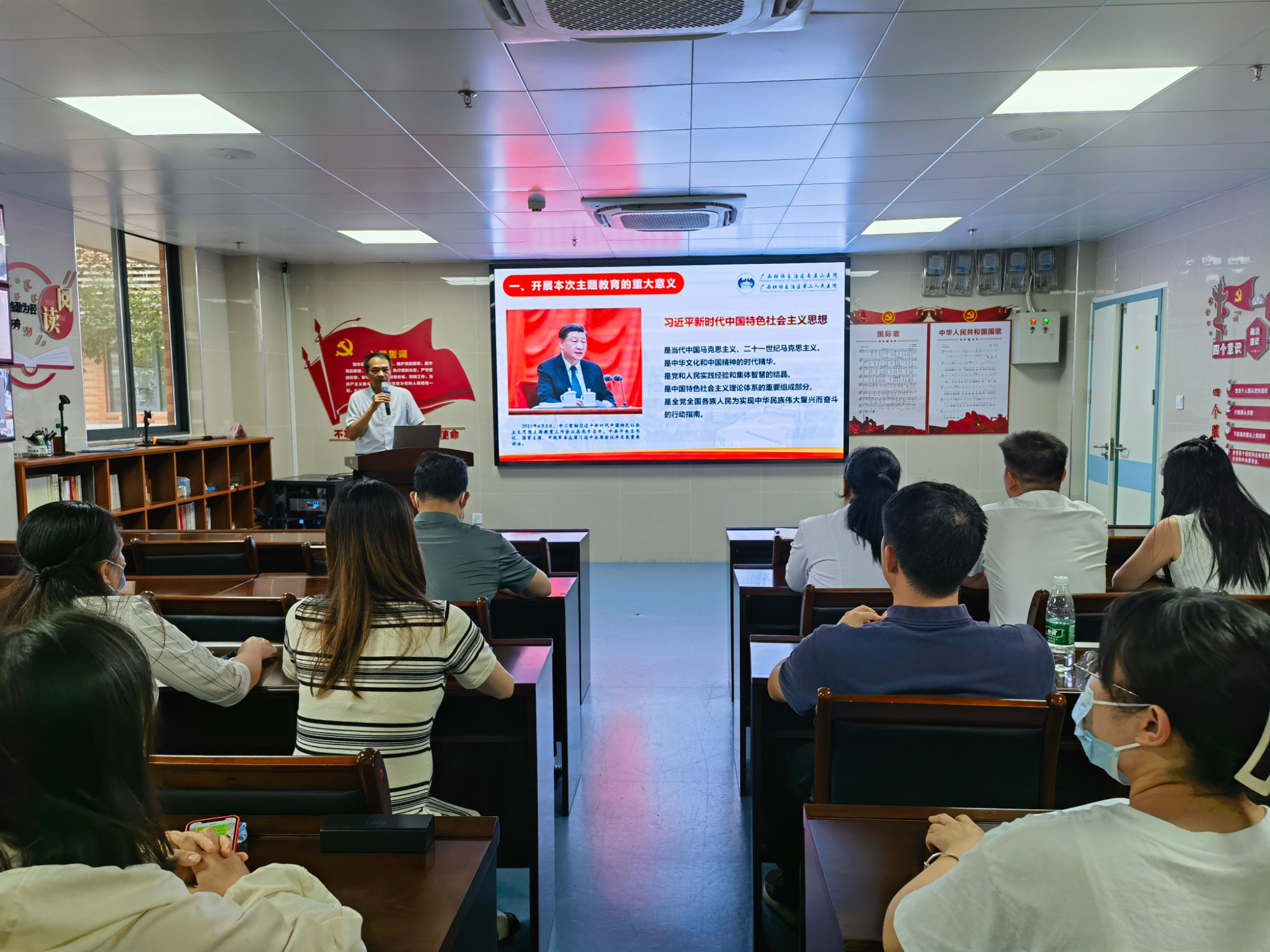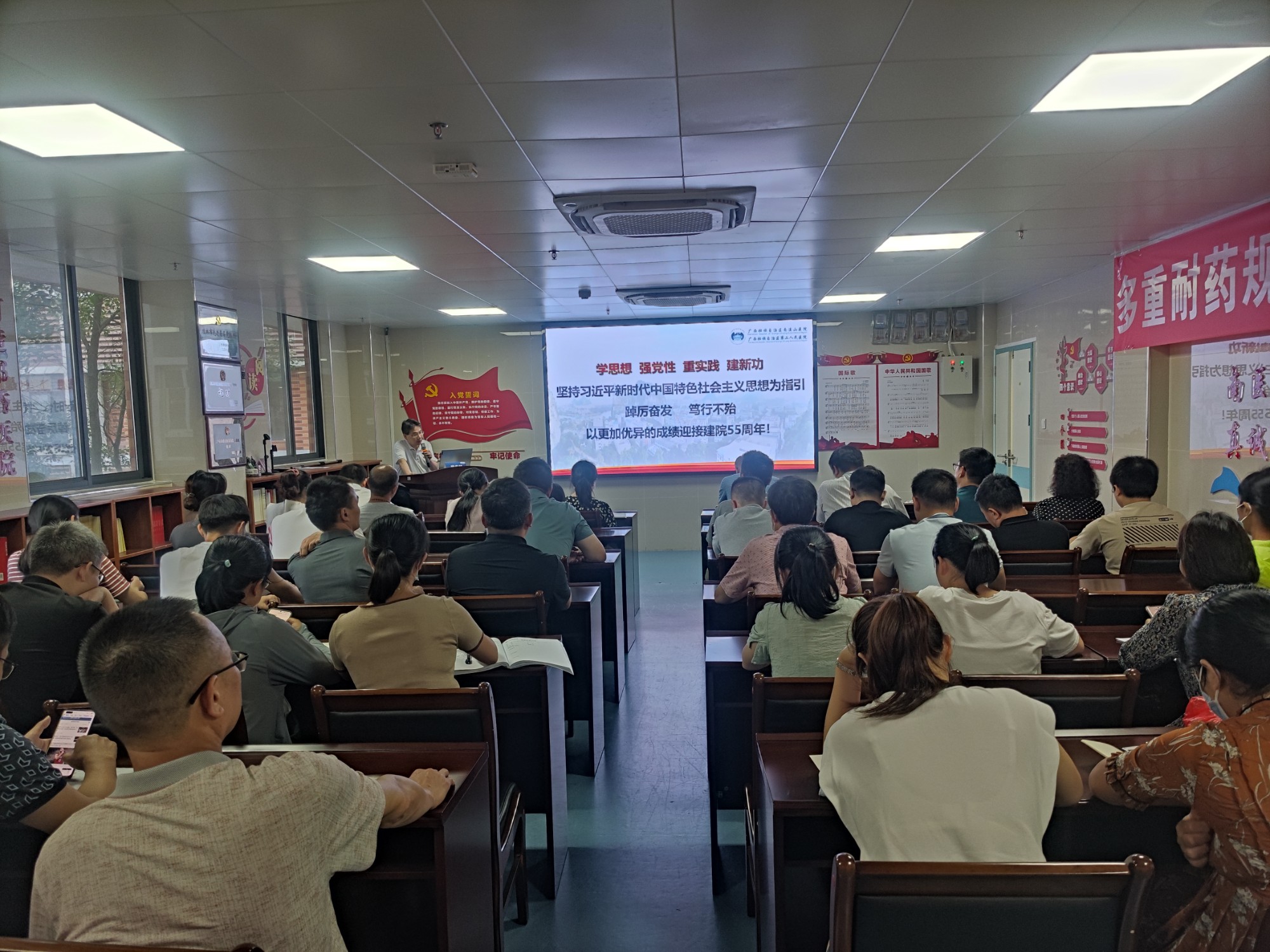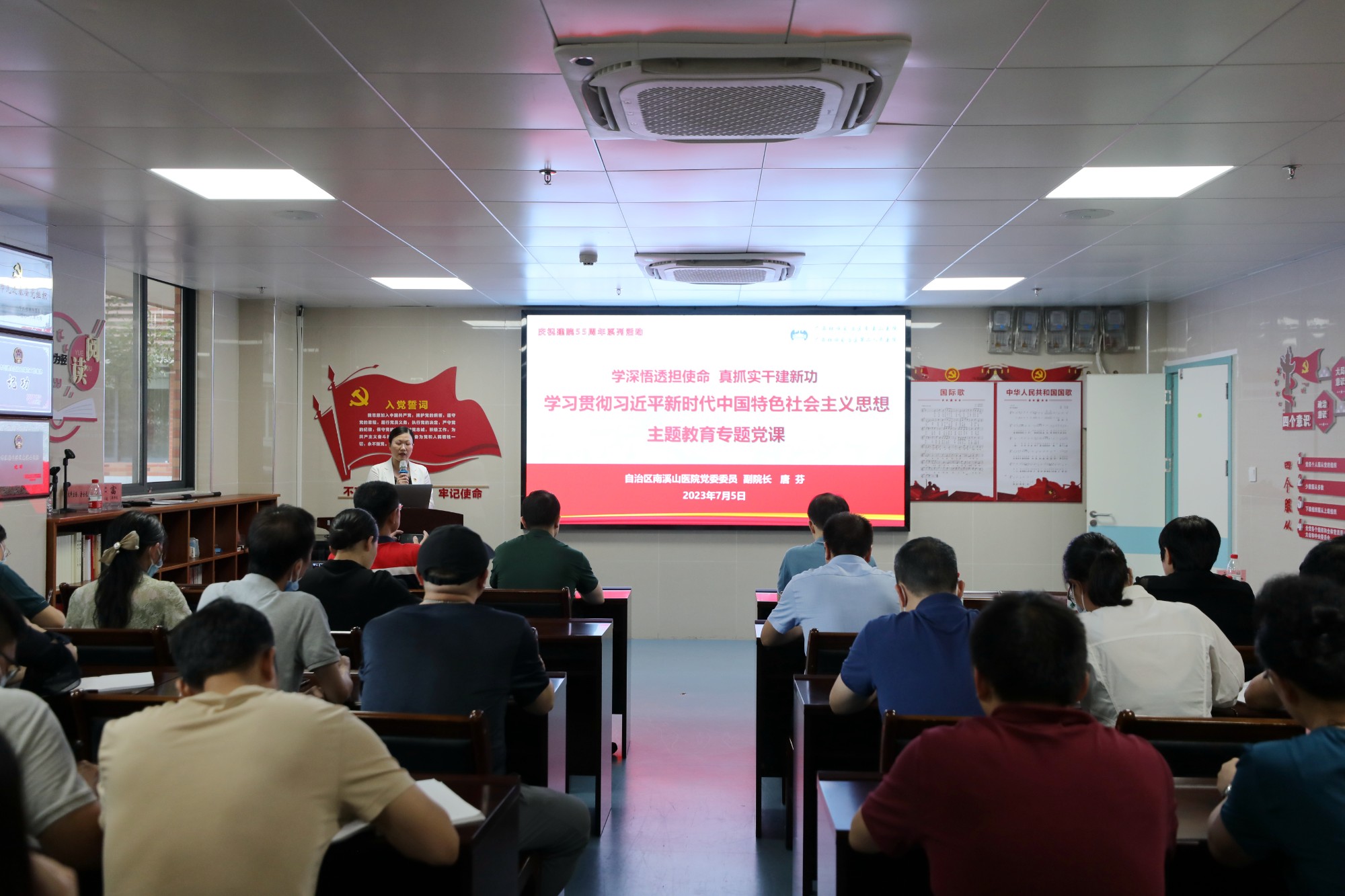 带头务实走心,全力守护健康。医院领导班子成员从开展本次主题教育的重大意义、开展本次主题教育的目标要求、深入推进主题教育的扎实开展、关于开展好主题教育的工作要求等四个方面授课,要求坚持不懈用习近平新时代中国特色社会主义思想凝心铸魂,牢牢把握主题教育的总要求,切实增强政治自觉、思想自觉和行动自觉,要在“以学铸魂”上下功夫,推动思想大解放;要在“以学增智”上下功夫,推动能力大提升;要在“以学正风”上下功夫,推动作风大转变;在“以学促干”上下功夫,推动工作大不同。要大力弘扬并深刻践行伟大建党精神,践行为民服务的真挚情怀,全力守护好健康广西北大门,坚持习近平新时代中国特色社会主义思想为指引,踔厉奋发、笃行不怠,以更加优异的成绩迎接建院55周年!