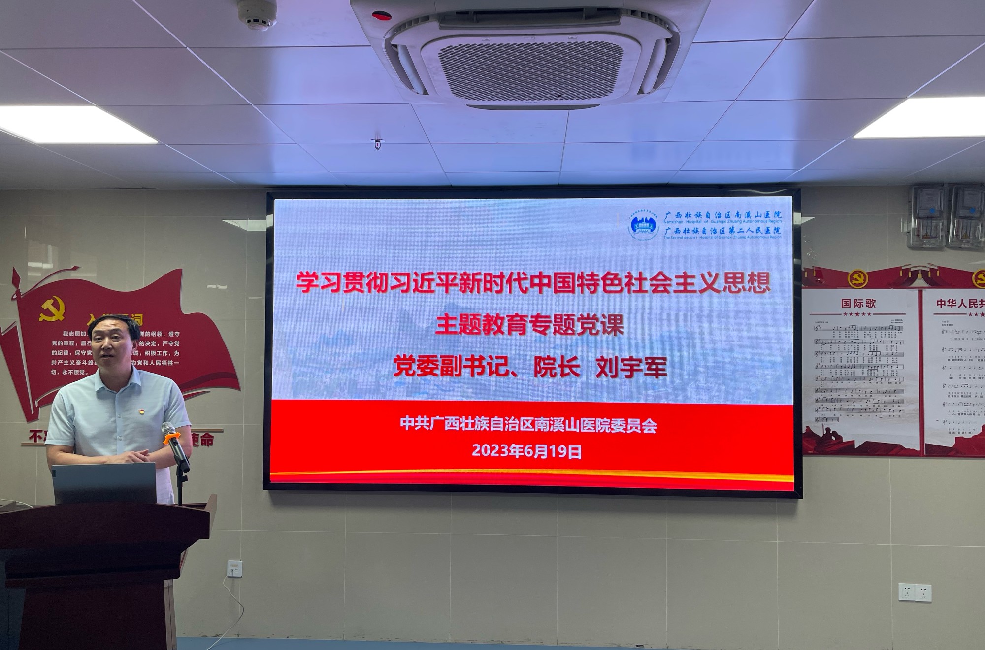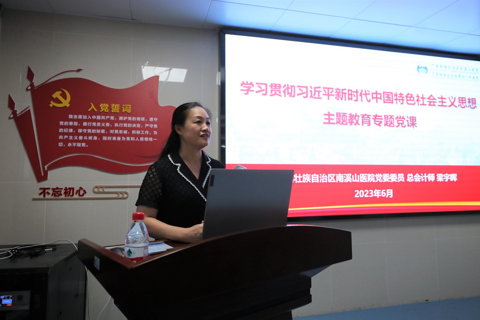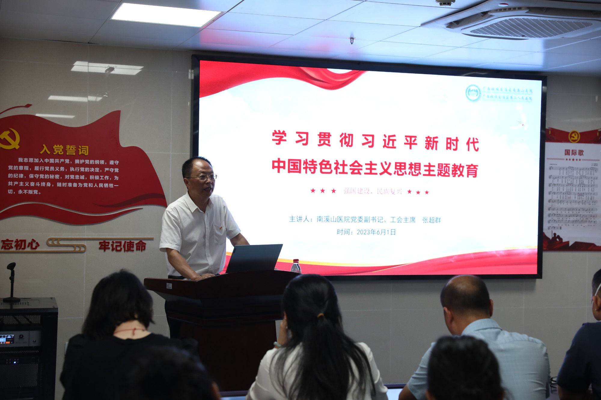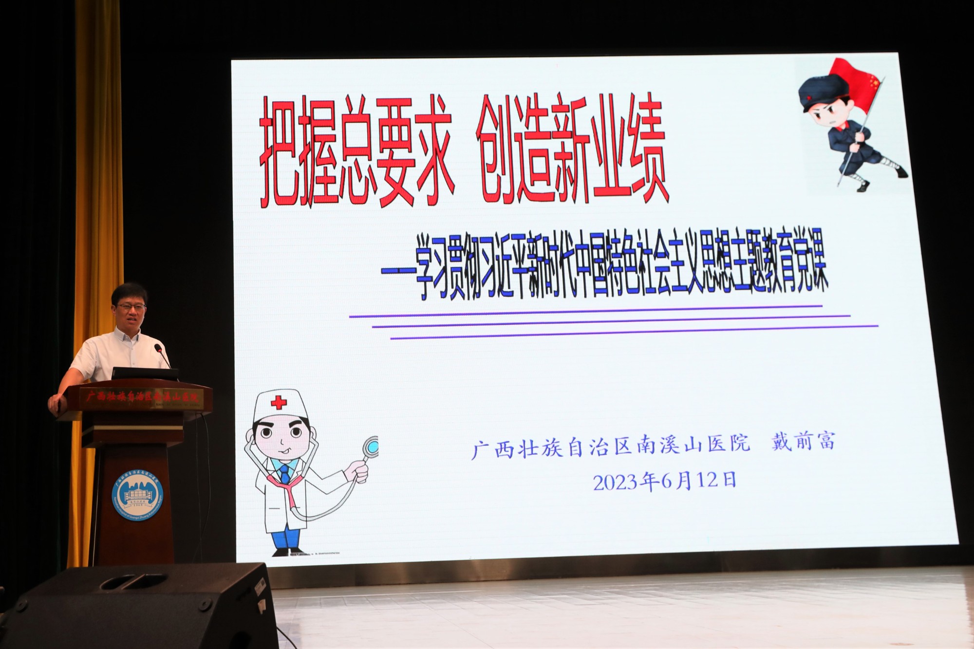 带头务实走心,全力守护健康。医院领导班子成员从开展本次主题教育的重大意义、开展本次主题教育的目标要求、深入推进主题教育的扎实开展、关于开展好主题教育的工作要求等四个方面授课,要求坚持不懈用习近平新时代中国特色社会主义思想凝心铸魂,牢牢把握主题教育的总要求,切实增强政治自觉、思想自觉和行动自觉,要在“以学铸魂”上下功夫,推动思想大解放;要在“以学增智”上下功夫,推动能力大提升;要在“以学正风”上下功夫,推动作风大转变;在“以学促干”上下功夫,推动工作大不同。要大力弘扬并深刻践行伟大建党精神,践行为民服务的真挚情怀,全力守护好健康广西北大门,坚持习近平新时代中国特色社会主义思想为指引,踔厉奋发、笃行不怠,以更加优异的成绩迎接建院55周年!