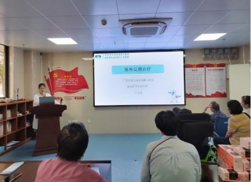 活动伊始,南溪山医院康复医学科主任秦文卓致辞,对患者及家属的重视表示感谢。随后,心血管内科二病区主任朱汉华以PPT的形式,讲述了冠心病的发生、发展、治疗以及注意事项,康复医学科心脏康复团队以《什么是心脏康复》、《体外反搏治疗》、《营养处方》等为题,以通俗易懂的讲解方式给患者带去了精彩的授课。课后还进行了运动康复指导和呼吸操的等示范。