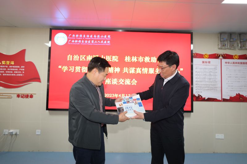 2.南溪山医院党委书记戴前富(右)向覃志强一行赠送医院文化丛书。李金戈摄