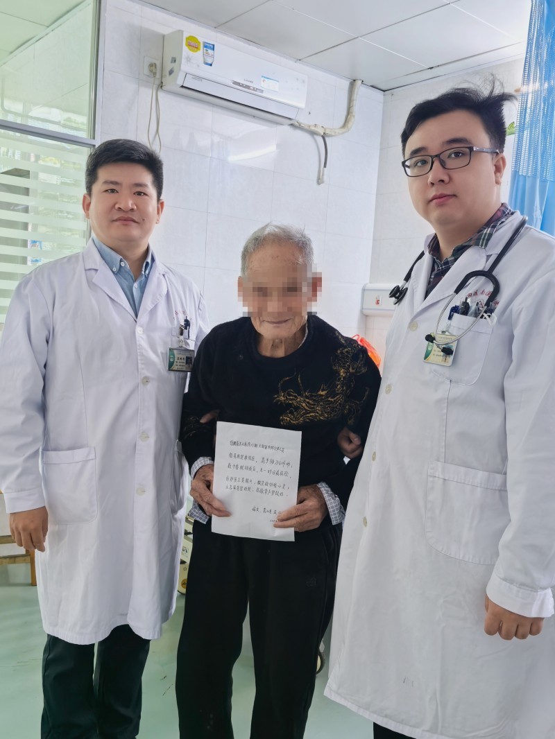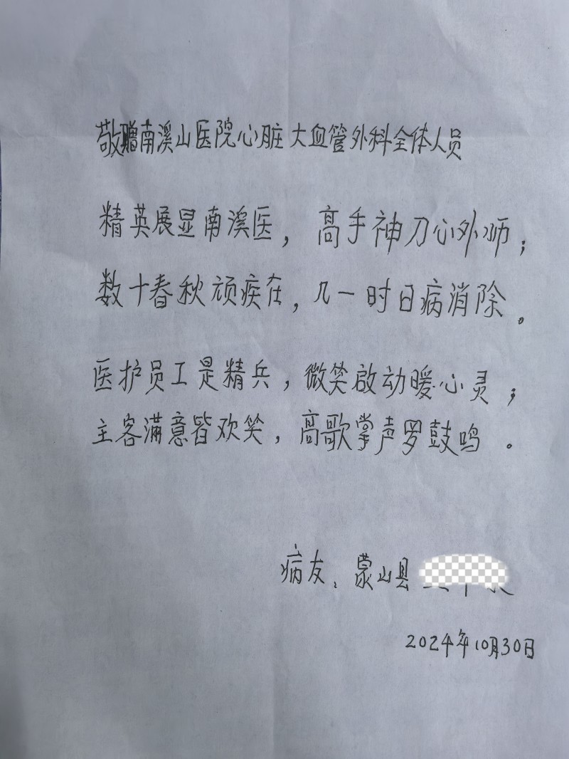一封满载深情的手写感谢信,一张洋溢着喜悦的合影,共同见证了蓝大爷在南溪山医院心脏大血管外科度过的那段不平凡的住院时光。