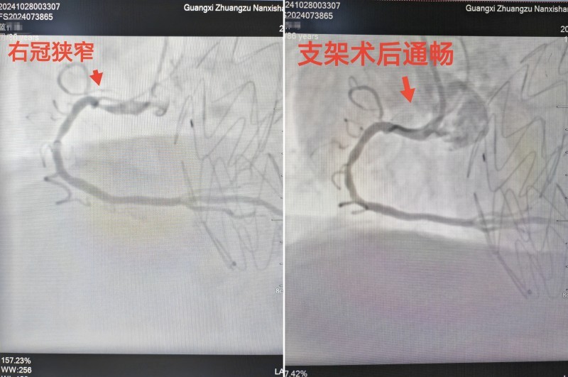 随后,在心血管内科屈妍副主任医师的会诊协助下,医生们进一步为患者进行了冠脉造影检查,发现冠脉三支病变,其中右冠开口处重度狭窄。于是同期植入了一枚冠脉支架,成功疏通了冠脉血管,“通路”畅通无阻。