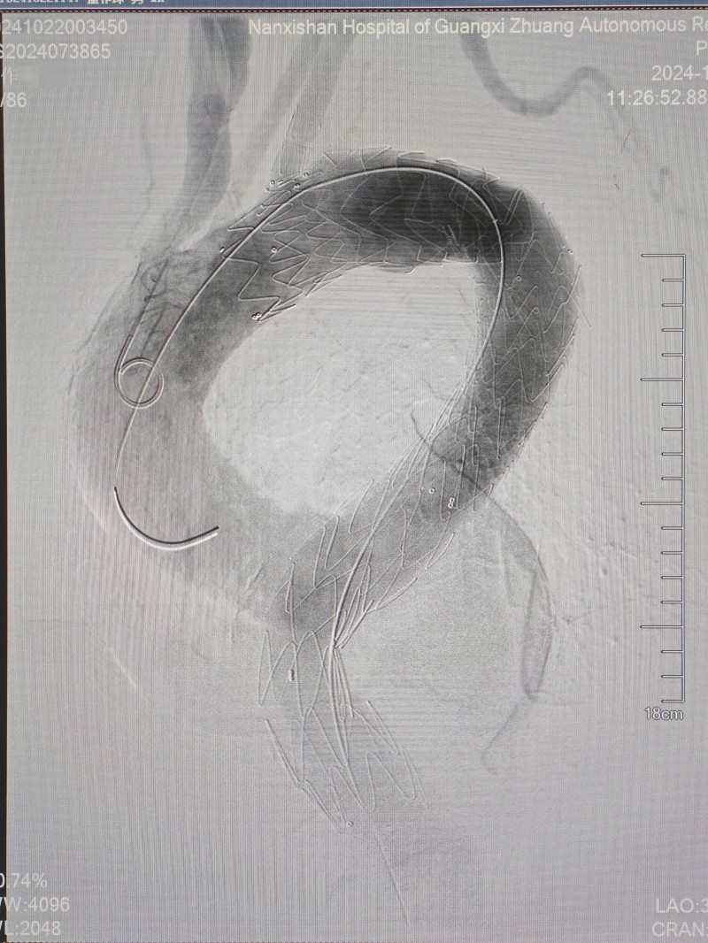 首先,医生们为患者进行了全麻下分支型胸主动脉覆膜支架腔内隔绝术。由于动脉瘤瘤体直径较大且累及范围较长,一个分支型覆膜支架无法完全覆盖瘤腔,于是在远端又接入了一个直筒支架。复查造影显示动脉瘤隔绝良好、无内漏,手术效果达到预期,“排雷”成功!