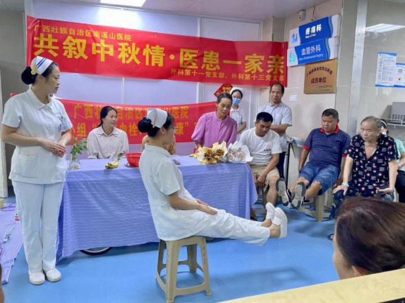 活动现场,外科第十三党支部书记杨平为与会患者及家属讲解压力性损伤、糖尿病足等相关知识的健康宣教。介绍秋季养生知识,引导患者和家属关注身体健康,预防秋季常见疾病。外科第十一党支部疼痛科、血管外科护长张唐馨为讲解如何预防下肢静脉血栓,并示范踝泵运动,以及讲解疼痛评估量表,让疼痛患者学会如何自我疼痛评估。