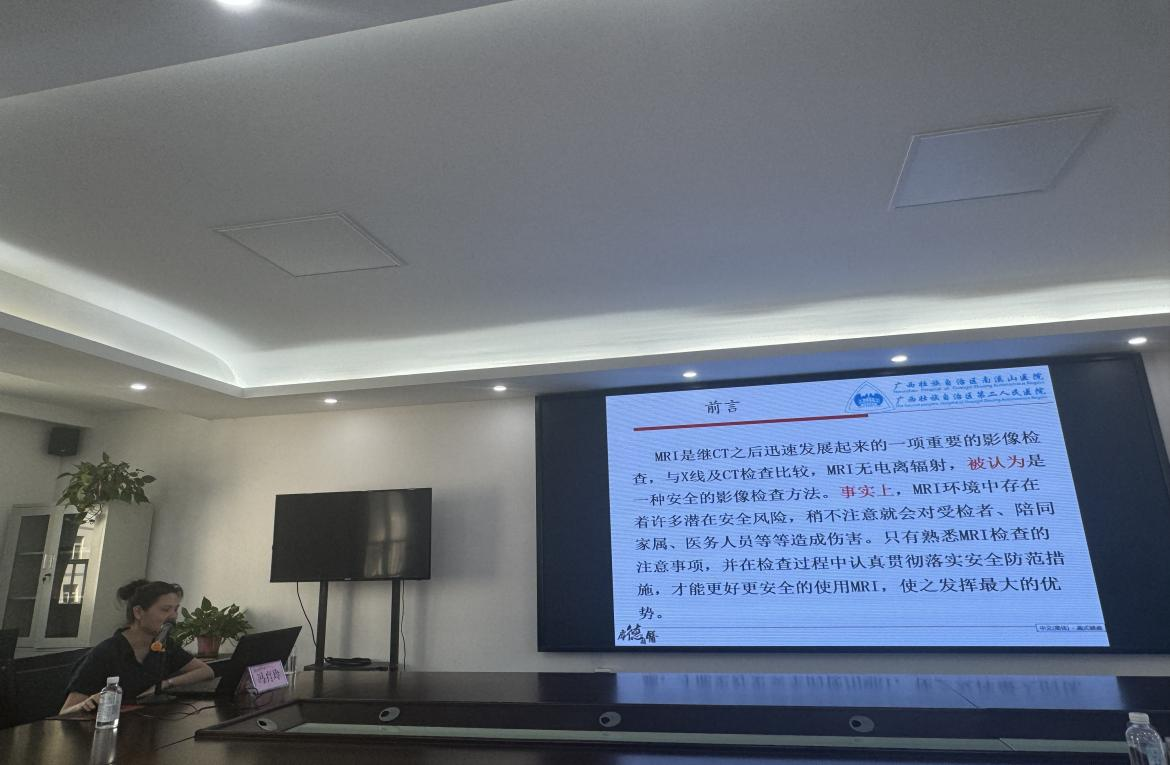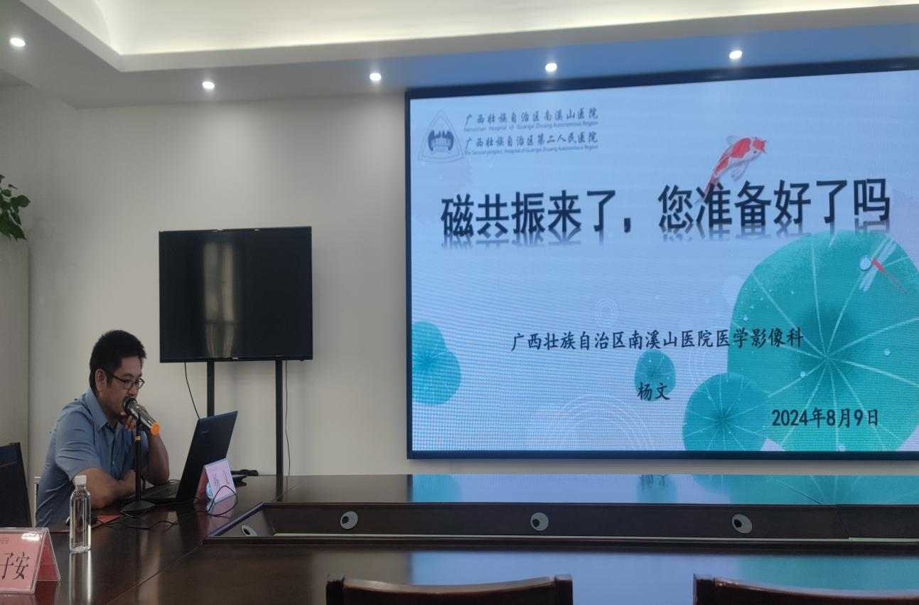 抵达灵川后,为支持该院放射科高效完成设备验收及后续的磁共振检查工作,自治区南溪山医院医学影像科主任杨文以《磁共振来临,您是否已做好充分准备?》为题,详细地阐述了磁共振在临床诊疗中的核心应用价值,并针对磁共振检查中普遍关注的各类问题,进行了详尽的解答。
