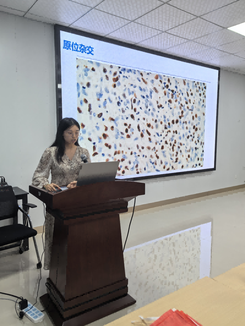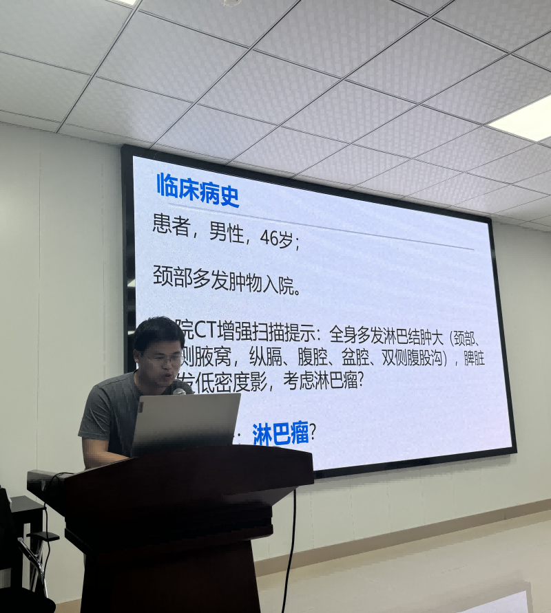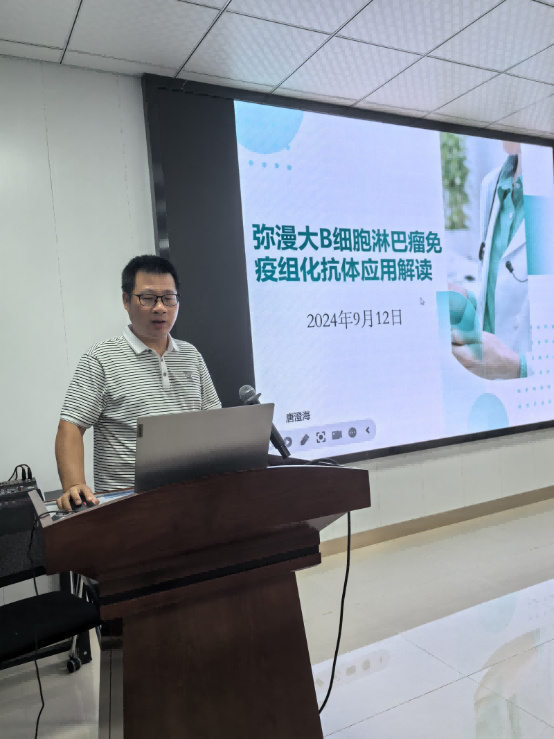 会议首先进行专业理论知识讲座学习,分别由医院病理科唐澄海副主任医师、李运千副主任医师介绍弥漫大B细胞淋巴瘤的免疫组化抗体应用解读及特殊类型大B细胞淋巴瘤相关专业知识。之后,进入实战病例分享阶段,由医院血液内科缪志超医师介绍一例难治性弥漫大B细胞淋巴瘤的临床特征,病理科李运千副主任医师、唐澄海副主任医师解读该患者的病理特点,罗泉芳主任、王薇副主任及全体参会人员进行病例讨论。接下来,病理科刘凯云及杨超月医师分别介绍淋巴瘤患者临床病例的镜下病理特点,罗泉芳主任、李运千主任及全体医务人员参与讨论。 最后,医院血液科主任罗泉芳在总结中表示,本次会议作为不同学科间的专业交流平台,不仅有助于推动各学科的共同发展进步,而且通过理论学习和病例分享,加深了与会者对弥漫大B细胞淋巴瘤的抗体应用以及特殊类型大B细胞淋巴瘤的理解。这种深入浅出的认识将转化为临床实践中的应用,从而进一步为患者提供更优质、更规范的诊疗服务。