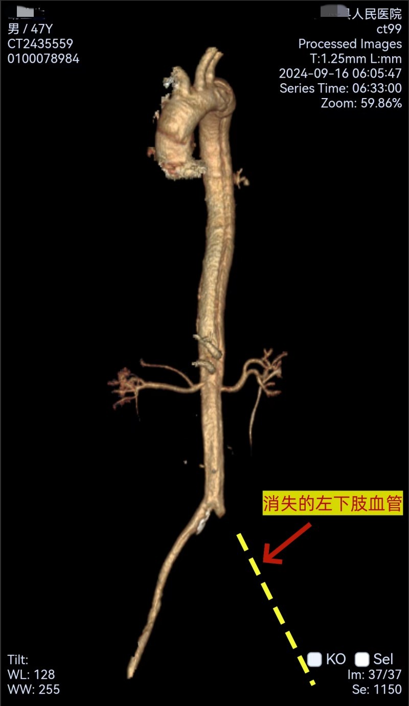 这位病友名叫胡某,年仅47岁。10小时前,因左下肢活动障碍而前往当地县医院就诊。经过初步检查,医生怀疑是脑卒中并进行了血管造影检查,但最终确诊为主动脉夹层和左下肢缺血。这一诊断结果让胡某的病情变得更加危急,因为如果处理不当,可能会出现主动脉夹层破裂致死或左下肢缺血严重到需要截肢的地步。由于当地县医院的救治条件有限,立即与南溪山医院启动了联合救治系统,将胡某转至该院进行进一步救治。