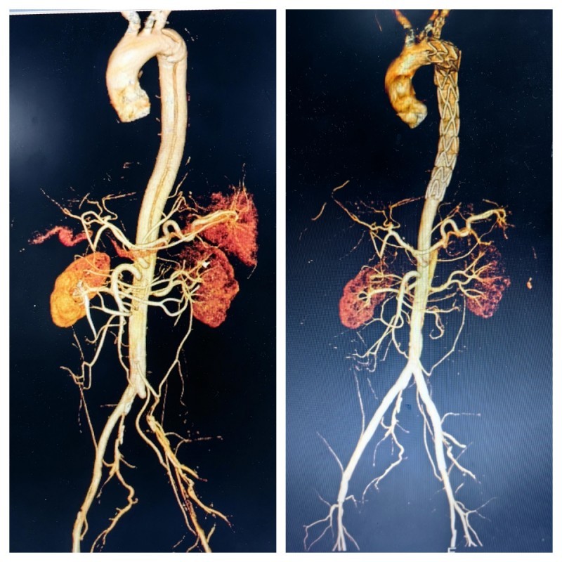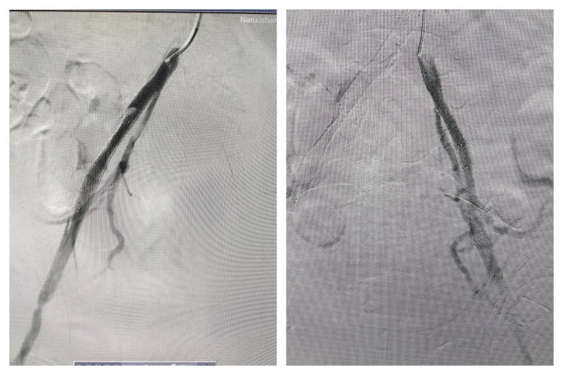 然而,医生们并未退缩,他们凭借着丰富的经验和精湛的技术,另辟蹊径,从上往下成功找到真腔,并顺利完成了手术。在胸主动脉近端置入覆膜支架一枚,覆盖内膜破口;开通闭塞的左髂总动脉并置入支架;右髂动脉细小真腔内也成功置入支架。手术成功封堵住主动脉内膜破口并恢复下肢供血,挽救了胡某的生命并保住了他的下肢。