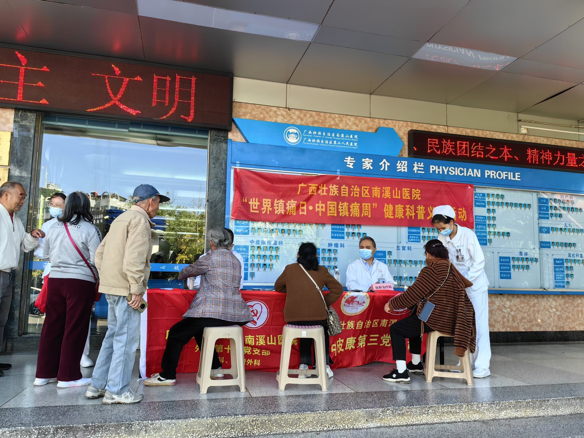 10月23日上午,广西壮族自治区南溪山医院疼痛科联合皮肤科性病科、放射治疗科在门诊大厅举行“世界镇痛日、中国镇痛周”健康科普义诊活动。