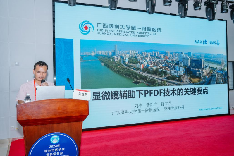 接下来是市内专家授课专场。桂林医学院附属医院沈翀教授向大会分享了脊柱内镜的十种常见术式,拓展了大家的视野;兴安界首骨伤医院副院长朱华教授深入浅出地阐述脱垂型腰椎间盘突出症分型与内镜入路选择;广西壮族自治区南溪山医院吴石奇教授结合其丰富的临床经验,向大家讲述半椎体畸形诊治要点;经典技术也有新应用,中国人民解放军联勤保障部队第九二四医院江海亮教授围绕显微镜主题,讲述显微镜辅助配合超声骨刀在颈椎前路ACDF&ACCF 应用;3D显微镜才是显微内镜的未来,来自兴安界首骨伤医院的吴楚光教授分享了3D 显微镜在脊柱外科手术中的应用体会,给人耳目一新的感觉;单侧双通道技术也不简单,桂林市人民医院林阳教授讲述单侧双通道脊柱内镜技术在腰椎感染性疾病中的价值与应用;小小内镜有独特应用方式,桂林医学院附属医院胡译文教授浅谈椎间孔镜治疗老年退变性侧弯的心得体会;百花齐放的脊柱内镜技术看似简单又不简单,桂林市中医医院石善龙教授结合自身临床实际,分享一例腰椎间盘突出症脊柱内镜术后疼痛的思考;广西壮族自治区南溪山医院的青年专家熊宇教授讲述了近期火热的全可视脊柱内镜微创技术,并进行相关病例分享。