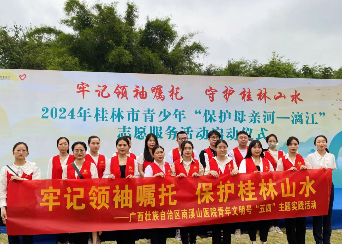 4月25日,广西壮族自治区南溪山医院团委组织青年文明号集体成员参加了共青团桂林市委主办的2024年桂林市青少年“保护母亲河-漓江”志愿服务活动启动仪式,并将此作为医院青年文明号“五四”主题实践活动的动员。