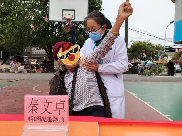 (南溪山医院康复医学科治疗师蒋珏玮正在为有肩痛问题的群众治疗)