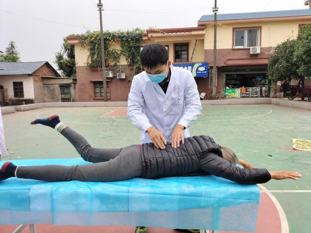 (南溪山医院康复医学科治疗师林有三正在为有腰椎问题的群众治疗)