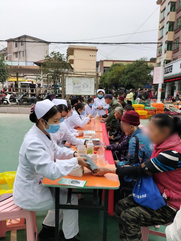 (义诊医护人员正在为群众量血压测血糖)