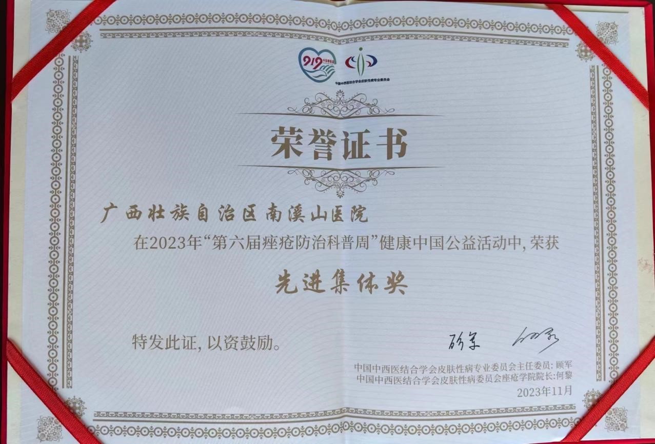 近日,中国中西医结合学会皮肤性病专业委员会对2023年度全国“第六届痤疮防治科普周”健康中国公益活动进行评选表彰,广西壮族自治区南溪山医院荣获先进集体奖。