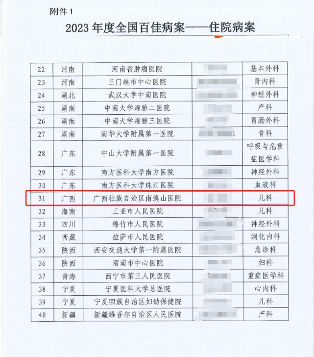 近期,在国家卫生健康委组织开展的全国优秀病案评选活动中,广西壮族自治区南溪山医院病案统计科选送的新生儿科赖旭芳医生书写的住院病案通过省级、国家专业遴选,最终荣获 2023 年度全国“百佳病案” 殊荣。南溪山医院成为此次国家评选中,广西区内唯一获奖的医疗机构!