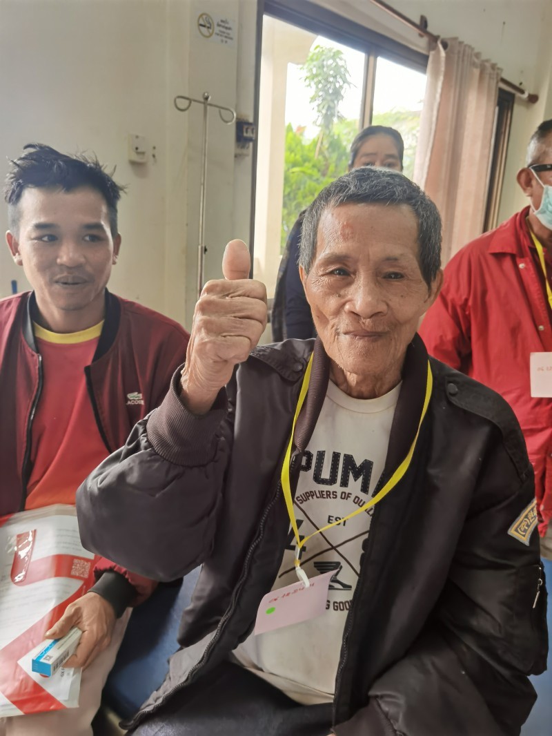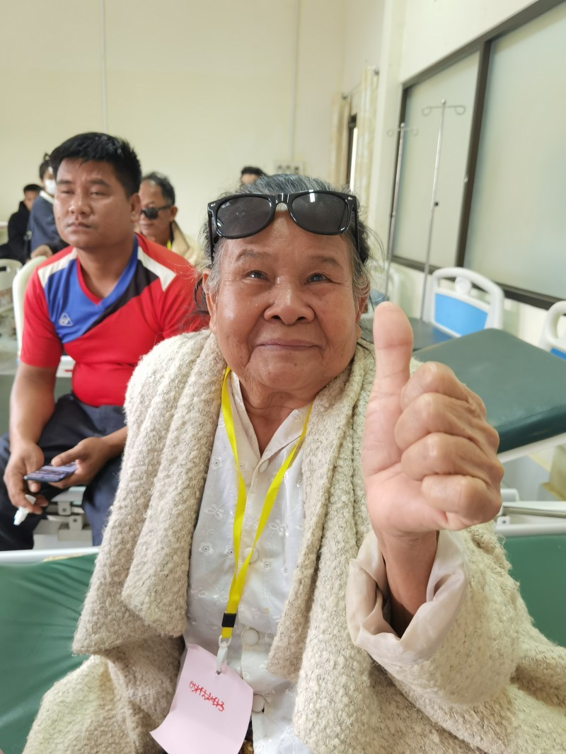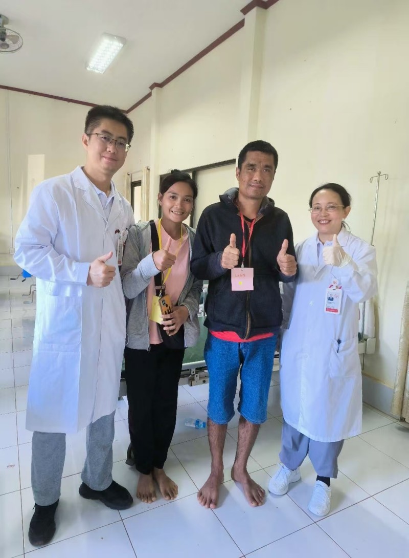 76岁的Linthong先生也是受益者之一。他去年在当地医院做了左眼白内障手术,因发生术中并发症而未植入人工晶体,术后视力未能得到改善;由于左眼手术的失败,即使右眼视力已经很差也不敢再进行手术。听说中国医疗队来筛查,他便和家人带着一丝希望来到筛查点。经过蒋艳华队长的检查和沟通,为他先实施了右眼白内障手术并顺利植入人工晶体,术后第一天右眼视力就达到了0.8。两周后,他又接受了左眼二期人工晶体植入手术,术后第一天视力也达到了0.2。他感慨地说:“中国医生,你们真是医术精湛,是我们心中的光明使者!”