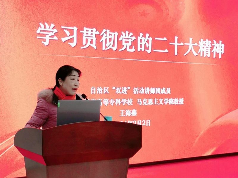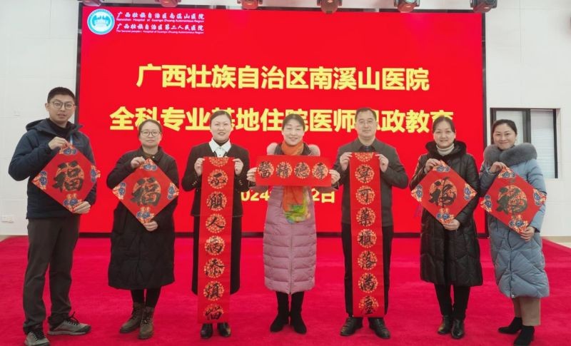 2月2日下午,自治区南溪山医院内科第十六党支部(全科医学科)为全科专业基地住培学员开展思政教育暨全科季度教学会议主题活动。该活动邀请到广西壮族自治区“双进”活动讲师团成员、桂林师范高等专科学校马克思主义学院教授王海燕教授为全科专业基地住培学员作“学习贯彻党的二十大精神—中国式现代化”主题宣讲并将亲笔手写对联及福字赠予全科专业基地。