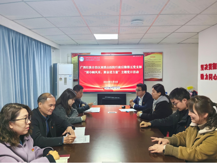 3月11日,广西壮族自治区南溪山医院行政后勤第五党支部围绕“国际劳动妇女节”开展“展巾帼风采 聚奋进力量”主题党日活动。
