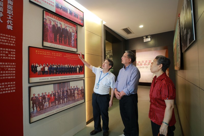 胡正跃仔细观看每一处细节,不断与大家交流心得,感谢院方为保留诸多老物件所作努力,对医院院史展览馆建设赞不绝口,强调要珍惜两国老一代领导人精心培育起来的中越友谊,努力使之发扬光大。