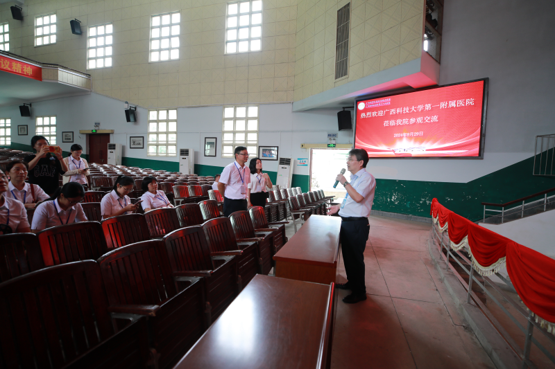 为进一步抓实党建工作,学习先进医院文化,深入推进公立医院党建高质量发展,9月29日上午,广西科技大学第一附属院党委书记庞晓红、党委副书记何曲波、纪委书记潘旭带领广西科技大学第一附属医院职能部门全体中层干部、护士长共 73 人到广西壮族自治区南溪山医院就党建工作、医院文化建设等工作进行交流学习。