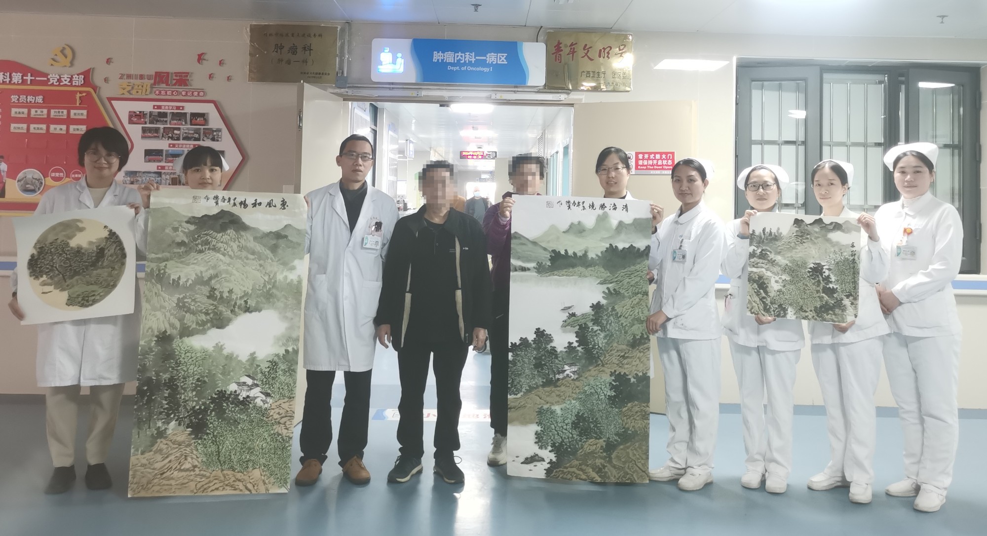 但杨老先生从去年就开始因肩关节疼痛而无法作画,曾在外院接诊期间误以为是肩关节炎,经过反复医治未见好转,后因疼痛逐渐加重,影响日常活动而到自治区南溪山医院就诊,经肿瘤内科一病区及创伤骨科手外科等多学科诊治发现,其手疼根本不是关节炎,而是肿瘤骨转移。当时杨老先生心灰意冷,以为这双手完了,再也不能作画了。肿瘤内科一病区扈鑫荣主任带领的团队经过仔细研究,为杨老选择了当下最先进的靶免联合治疗及局部放射治疗,目前杨老的状态明显得到改善,疼痛明显减轻,手臂活动能基本恢复如初,如今的杨老,又可以继续用双手追逐他所热爱的艺术创作。所以杨老先生为表达感激之情,特意画了多幅画作赠送给肿瘤内科一病区的医护人员。