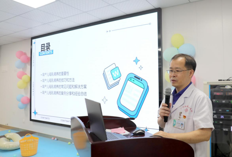 在专家讲座环节,莫炜明主任详细阐述了早产宝宝母乳喂养的重要性,并向家长提供了专业的指导和建议。莫炜明强调,肌肤接触对所有婴儿都有好处,尤其是早产、低出生体重及患病新生儿。肌肤接触应在婴儿出生后立即开始,有助于提高婴儿对抚摸和情感的感知,并在维持母乳喂养方面起着至关重要的作用。