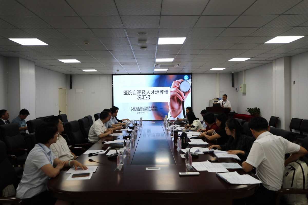 为加强卫生健康科技创新平台和高层次人才队伍建设,6月7日,自治区卫生健康委科教处二级调研员何雪红、广西医科大学第二附属医院副院长罗小玲带领专家组成员一行7人到自治区南溪山医院开展2024年度骨科重点(培育)学科进行考核工作会议,会议由南溪山医院党委副书记、院长李朝旭主持,南溪山医院副院长胡长付、桂林市人民医院副院长孙江滨及两家单位相关科室负责人参加会议。