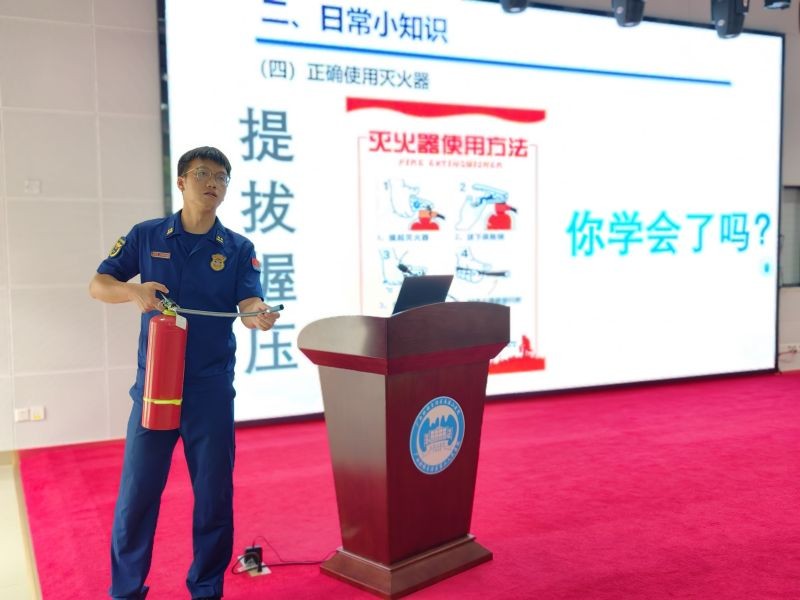 李东源副站长通过对近年以来区内外火灾事故的典型案例剖析,就火灾事故的成因及报警救援、各种火灾的紧急处理措施、消防安全工作的日常预防及电动车火灾危害和防范措施等方面进行了详细讲解,并对灭火器的使用进行了现场示范,有针对性地提升参训人员的火灾预防、处置及组织疏散逃生能力。