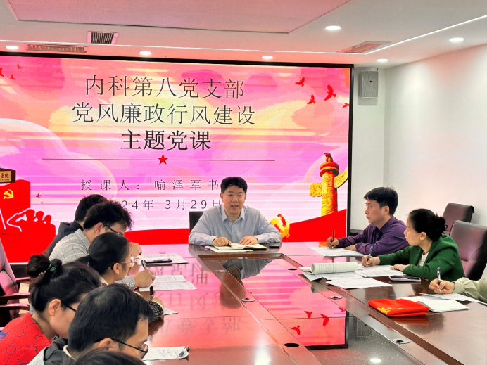 会上,支部联系院领导、医院党委委员、纪委书记喻泽军同志对支部全体党员进行2024年党风廉政行风建设主题党课和医疗反腐工作进行例行谈话,他结合案例进一步剖析目前医疗反腐的现状以及态度,以案为鉴、借案反思,强调医务人员务必从根源坚守纪律防线,推进医院的清廉医院建设,打造风清气正的医疗环境。