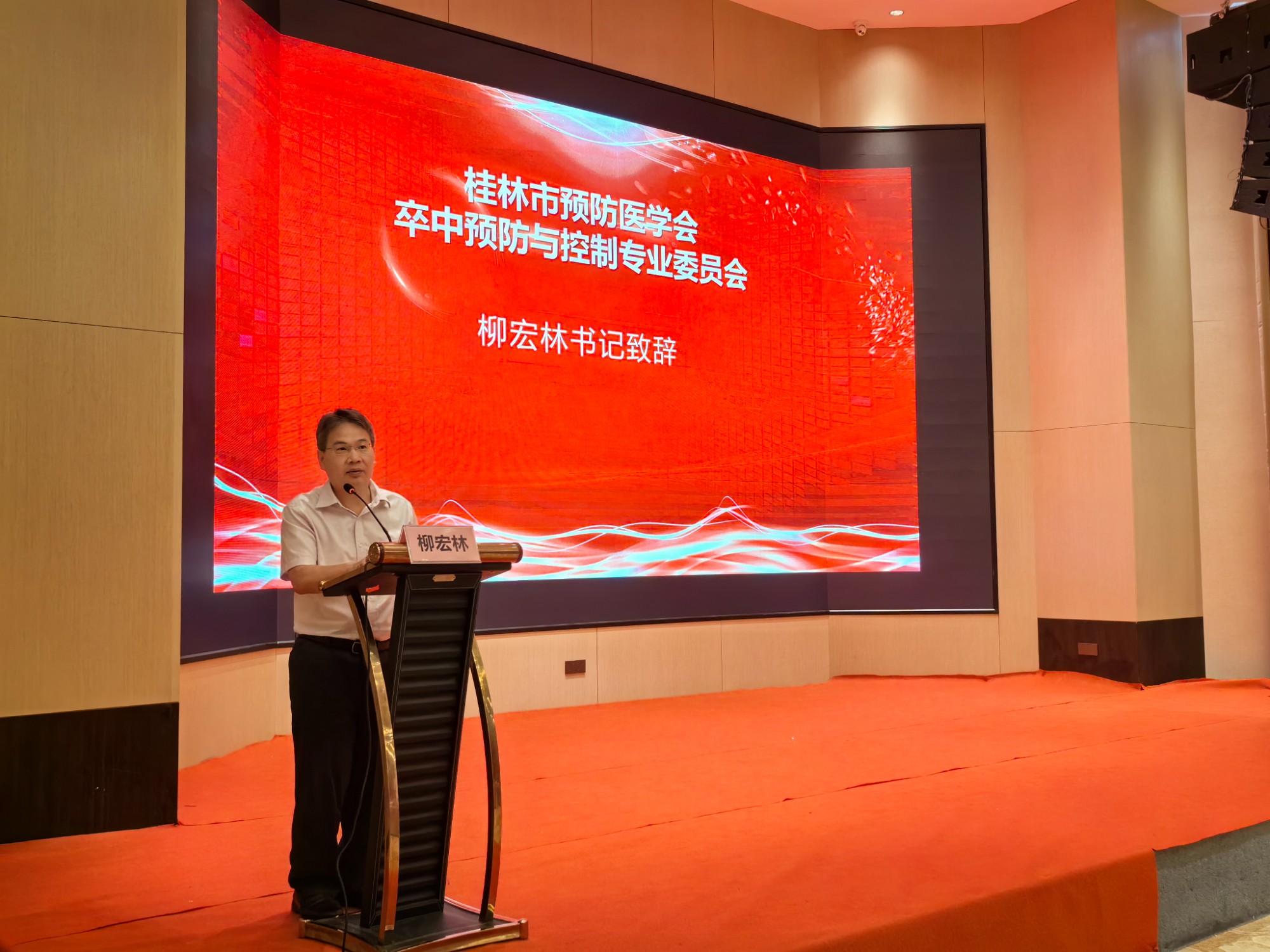 南溪山医院党委书记柳宏林代表医院在会上致辞,对桂林市预防医学会的信任和支持表示感谢,并对参会的各位领导、专家表示诚挚的欢迎。他表示,此次专业委员会的成立标志着桂林市卒中预防与控制工作迈上了一个新的台阶,将为桂林乃至广西的公共卫生与预防医学领域带来积极的影响。柳宏林强调了脑卒中的严峻形势,呼吁参会嘉宾积极参与交流,共同提升卒中预防与诊疗的技术水平。