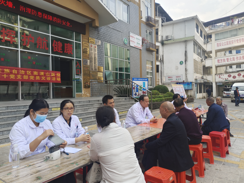 11月16日上午,为持续推进县区域紧密型医联体建设,进一步满足基层群众日益增长的就医需求,提升基层群众的幸福感、获得感,广西壮族自治区南溪山医院内科第十党支部义诊团队来到龙胜各族自治县人民医院院前广场为当地居民提供免费的医疗服务。