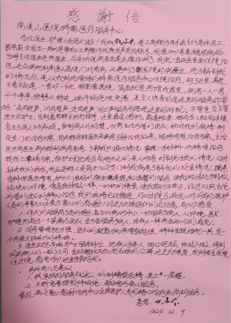 自治区南溪山医院特需医疗病区上演医患情深劳模致谢送感谢信
