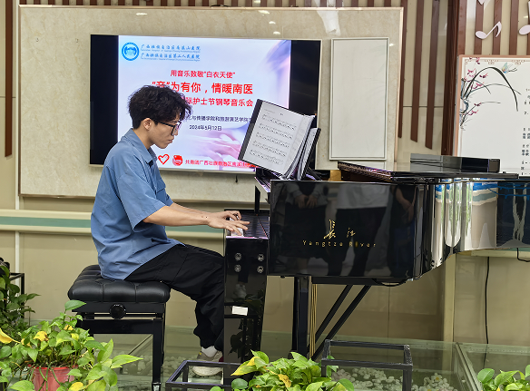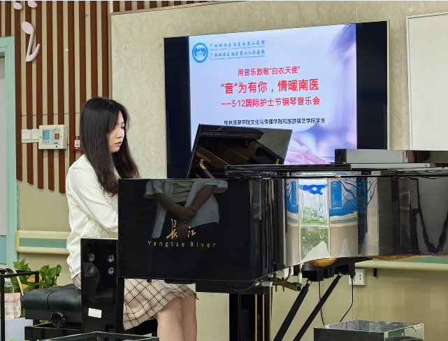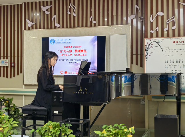 5月12日下午,广西壮族自治区南溪山医院住院部6号楼一楼琴声悠扬,余音袅袅。正值第113个国际护士节,医院团委举办了“‘音’为有你,情暖南医”主题钢琴音乐会,用音乐传递爱与希望,向辛勤工作在一线的护理人员表达敬意和节日祝福。