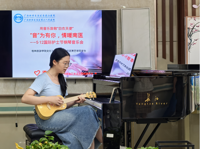 本次钢琴音乐会的志愿者是来自桂林旅游学院文化与传播学院和旅游演艺学院的学生,8名同学轮番上场,倾情演奏了一首首悠扬动听的曲目,为“白衣天使”送上最美的祝福。