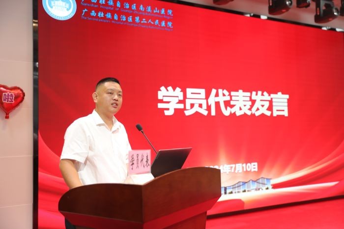 2021级外科专业基地李浩斌作为2024届结业住院医师代表发言。他满怀深情地感谢医院、专业基地、轮转科室和指导老师们的悉心培养。三年的住培生涯不仅培养了他们扎实的临床技能,也培养了他们较高的职业素养。在未来的从医生涯中,他们将以更坚定的信念和更饱满的热情,在热爱的岗位上发光发热,为促进人类健康事业发展贡献重要力量。