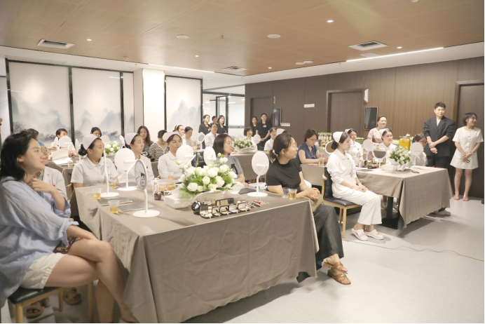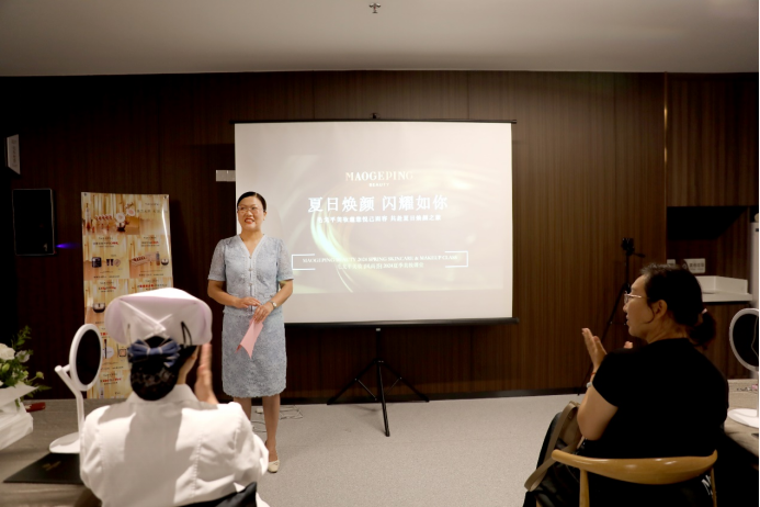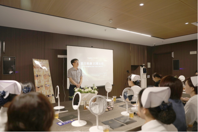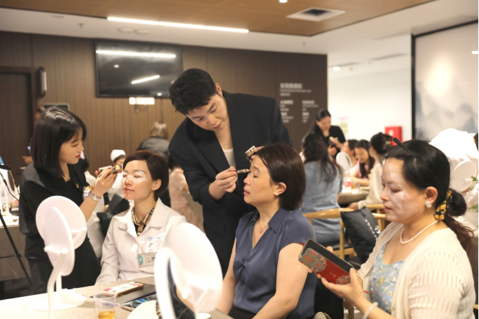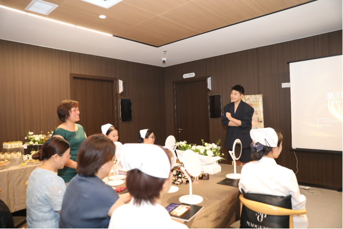 妆容培训课上,毛戈平首席美妆讲师田浩为与会者讲解了淡妆礼仪的重要性,并现场演示了针对不同脸型、肤色、五官该如何进行妆容修饰,让大家在日常工作中能以更好的仪容仪表展示出良好职业形象。
