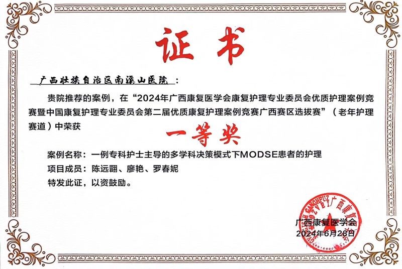 自治区南溪山医院护理案例荣获2024年广西康复医学会康复护理专业委员会优质护理案例竞赛一等奖