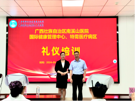 为进一步深化优质医护服务内涵,加强医护礼仪修养,树立良好的职业形象,5月29号下午,广西壮族自治区南溪山医院特需医疗病区与国际健康管理中心开展了医护职业礼仪培训,本次培训紧密围绕医护礼仪的核心要点展开,为医护提供全方位的培训和指导,让每一位医护都能以更专业、更优雅的形象为患者提供更优质的服务。医院党委副书记、院长李朝旭等相关科室负责人参加了本次培训。