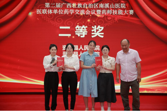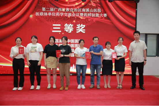 接下来是激烈而精彩的药师知识竞赛环节,有7支队伍来自6家医联体单位参加本次比赛,团队含1名领队和2名队员组成,其中领队担任评委。比赛包括必答题、抢答题和医嘱审核三个部分,选手们积极准备,在比赛中表现的都非常优秀,获得现场观众的热烈掌声,经过紧张而激烈的角逐,最终7支队伍分别获得一、二、三等奖。一等奖获得者为自治区南溪山医院选手,二等奖获得者为资源县人民医院选手和灵川县人民医院选手,三等奖获得者为荔浦市中医院选手、永福县中医院选手、富川瑶族自治县人民医院选手和龙胜各族自治县人民医院选手。