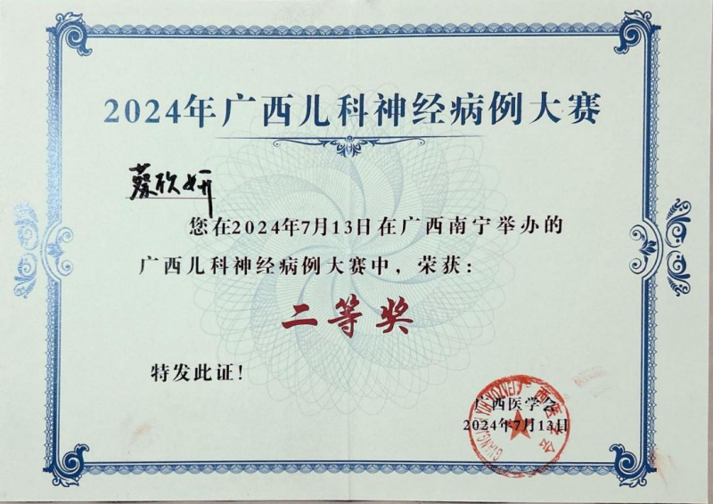 自治区南溪山医院儿科医生蔡欣妍在广西儿科神经病例大赛荣获二等奖