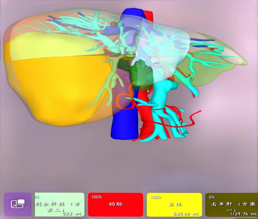 面对这一挑战,自治区南溪山医院肝胆胰脾外科团队进行了周密的术前准备。通过与上海交通大学合作的3D打印中心的通力合作,杨志坚、黄芳医生利用增强肝脏CT进行三维重建,精确计算出需切除的肝脏体积、残肝体积以及残肝体积占标准肝体积的比例,确保剩余的肝脏能够满足王先生的生理需求。同时,针对王先生腹部烧伤后腹壁无法松弛的特殊状况,杨志坚牵头进行医院多学科会诊,医生们制定了前入路切除右半肝的手术方案,力求在狭窄的操作空间内减少出血并降低术后肝衰竭的风险。