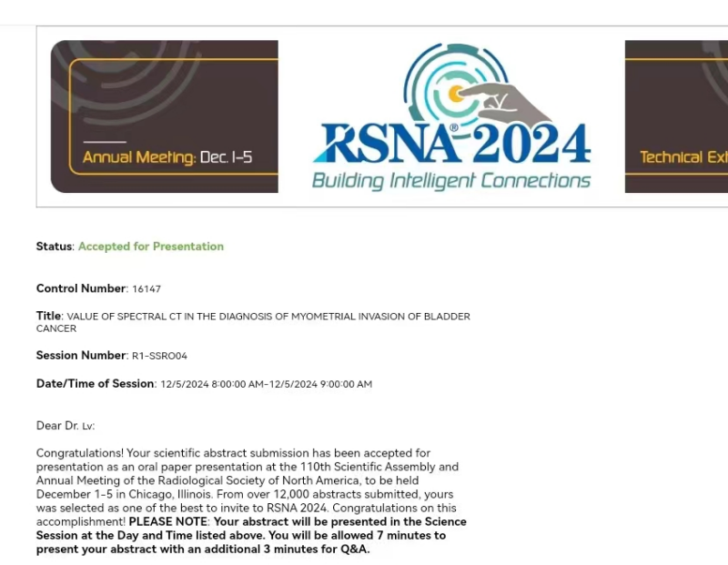 喜报!南溪山医院影像科吕健获邀参加北美放射学会(RSNA)年会并发言
