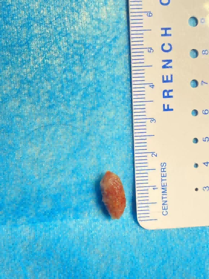 屈东明主任用气管镜进入气道,镜下可见异物横跨气管上段,镜子无法通过,于是给予一次性使用电圈套器套出一大小约15*7mm枣核,同时给予止血对症处理。手术过程顺利。在手术后的观察期间,乐乐恢复良好,无并发症及不良反应。